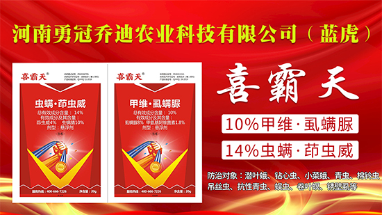 河南勇冠喬迪農業(yè)科技有限公司(藍虎)【10%甲維·虱螨脲+14%蟲螨·茚蟲威-喜霸天】本品由兩種具有不同作用機制的殺蟲有效成分混配而成,適于害蟲綜合治理及抗性管理;具有胃毒、觸殺作用,且具有一定的殺卵作用,滲透性強,殺蟲速度快,持效期長,耐雨水沖刷。