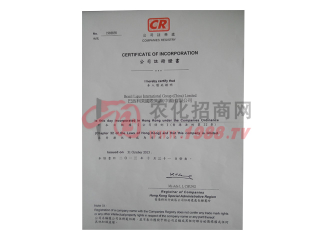 證書名稱:公司注冊證書 發(fā)證機構:香港特別行政區(qū)公司注冊處