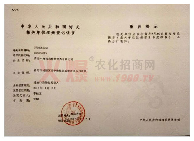 青島中澳西農(nóng)作物營養(yǎng)有限公司經(jīng)過多年的發(fā)展,于2015年正式成為多元化地進(jìn)口產(chǎn)品營運(yùn)商。不僅分銷國外先進(jìn)的植物營養(yǎng)產(chǎn)品,還分銷國外的農(nóng)副產(chǎn)品(如葡萄酒、咖啡等)。公司在全國多地設(shè)有辦事處和周轉(zhuǎn)倉庫。