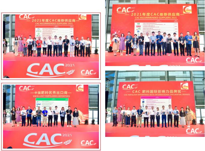 第九屆CAC獎(jiǎng)?lì)C獎(jiǎng)典禮于6月22日下午2:00在上海新國際博覽中心3號(hào)入口廳隆重舉辦。頒獎(jiǎng)典禮上隆重揭曉了肥料優(yōu)質(zhì)出口商、CAC肥料國際影響力品牌獎(jiǎng)、2020海外市場拓展獎(jiǎng)、2021年度CAC推薦供應(yīng)商的獲獎(jiǎng)名單,46家肥料企業(yè)喜獲獎(jiǎng)杯。